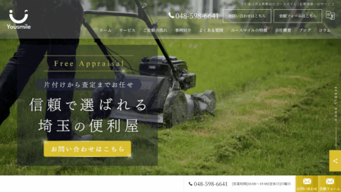 不要物が積み重なった住まいのゴミ屋敷清掃、庭の草刈り・草むしり、電球交換のような細かな依頼——便利屋としてのユースマイルは、専門業者では断られがちな幅広い依頼を引き受ける。埼玉県熊谷市本町に拠点を構え、群馬県まで出張。営業時間は10〜19時で日曜定休、電話は048-598-6641だ。