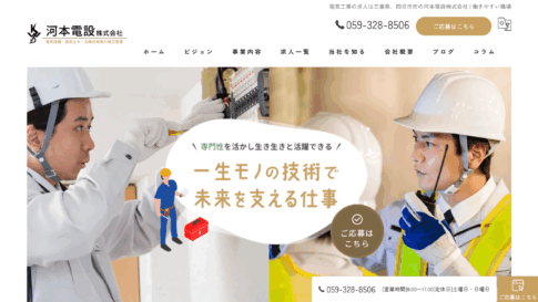 「工場の高圧設備を入れ替えたい」「事務所の照明を丸ごとLEDに切り替えたい」——河本電設株式会社への問い合わせには、現場の種類も規模感も様々なものが届く。高圧電気工事・低圧電気工事・LED工事・電気土木工事・太陽光発電工事の5分野を手がけており、四日市市の西山町を拠点に愛知・岐阜・三重の東海3県が主な活動エリアだ。電気土木の分野では、電線の地中埋没や電柱設置といった社会インフラの整備にも携わっている。